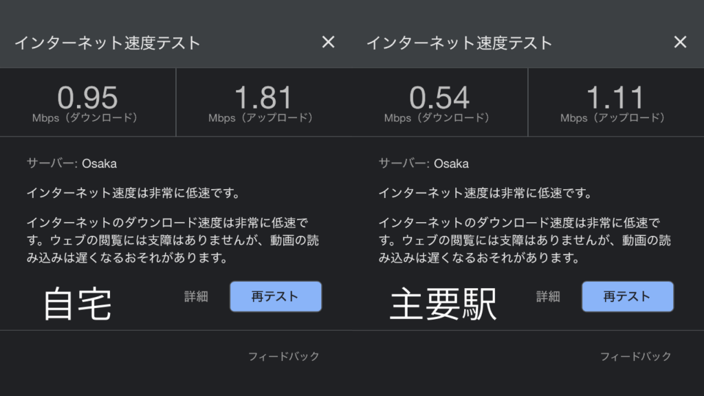 タイミングにもよると思うけど、自宅でも1Mbpsはでていなかったし、人が多い主要駅では0.5Mbps程度しかでていなかった。